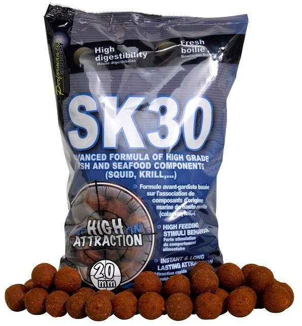 SK30 je bezesporu nejpoužívanější recepturou mezi závodníky na těch nejtěžších kaprařských soutěžích. Tajemstvím účinnosti SK30 na dlouhodobějších výpravách nebo závodech je kombinace špičkové olihňovo-krillové směsi s unikátním přírodním olejem, který vyvolává u ryb potravní závislost, čímž lze dlouhodobě udržet rybu na krmném místě.
