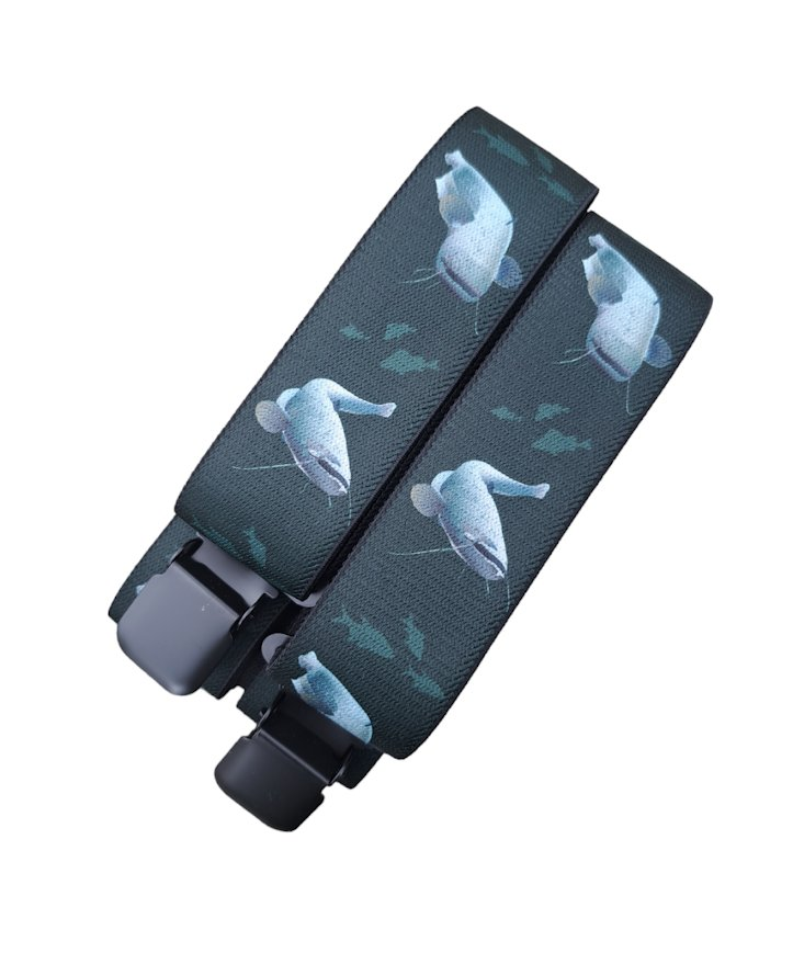 Elastické originální šle, šíře 40mm, v provedení Y s motivem pro rybáře motiv sumec Kšandy s rybou jsou skvělý doplňkem pro každého rybáře Kovové přezky Více informací
